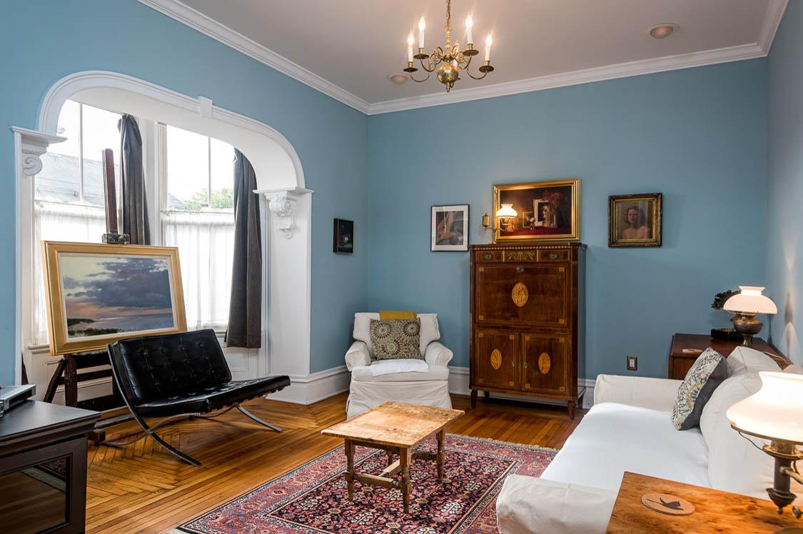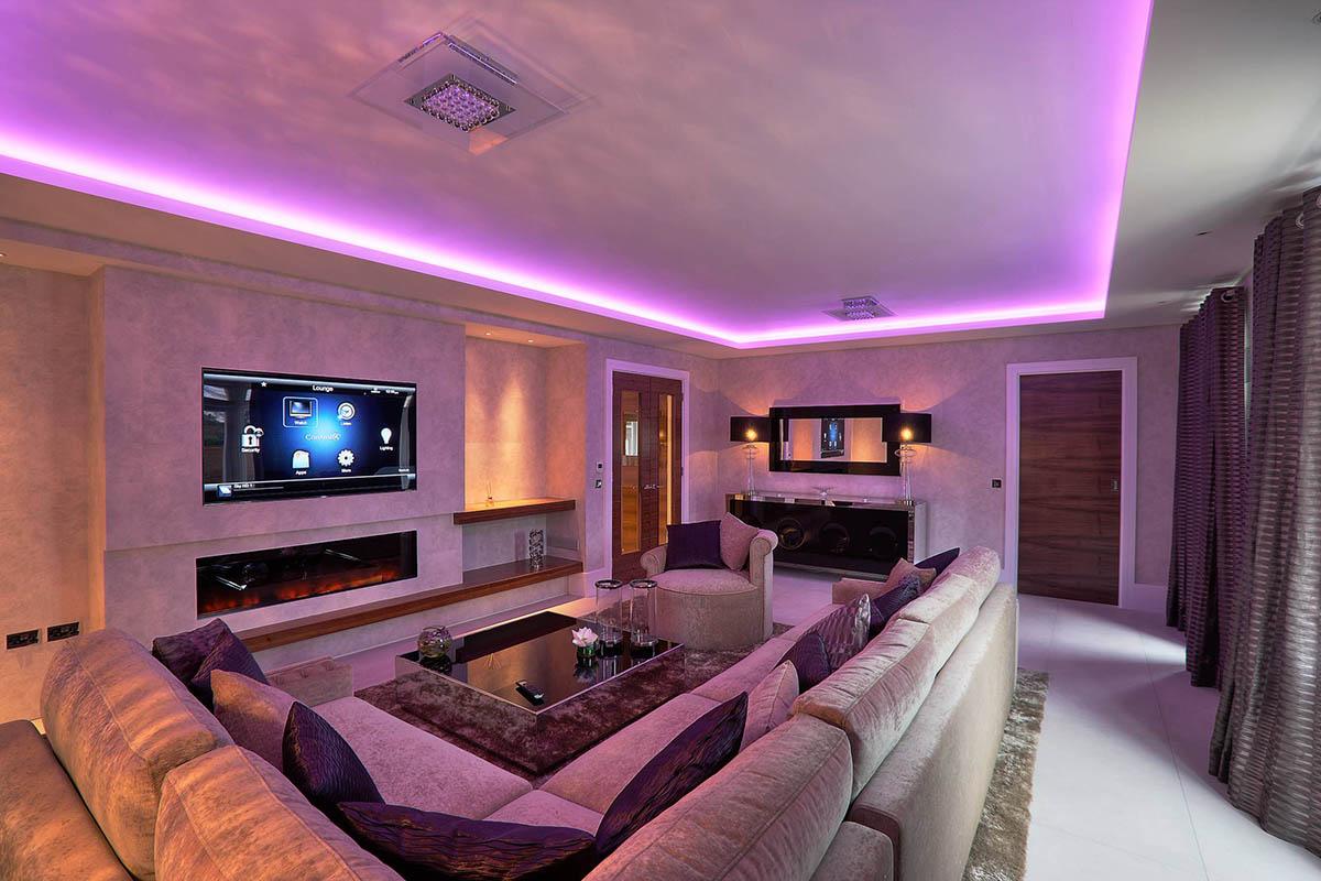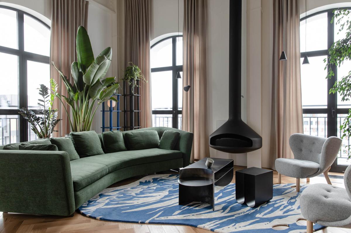 Дизайн гостиной сочетает в себе современные и уютные элементы. Центральное место занимает большой бежевый диван, создающий комфортную зону отдыха. На полу расположен светлый ковер с текстурным узором. Контрастной деталью является черная акцентная стена, на фоне которой выделяются светлые элементы декора. В комнате существует хорошее сочетание текстур, включая дерево и текстиль, что придает пространству теплоту и стиль. На потолке подвешена современная люстра, добавляющая изысканности. Общая атмосфера комнаты – комфорт и современный дизайн.